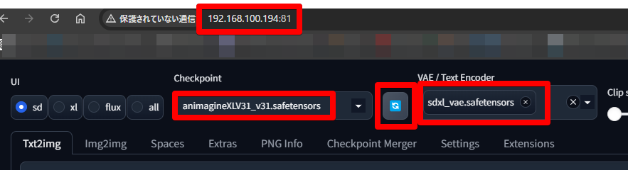 ブラウザのアドレスバーに http://<WebUI が稼働するホストのIPアドレス>:81 を入力して WebUI にアクセスします。画面上の Checkpoint 横の更新アイコンをクリックした後、 Checkpoint と VAE をリストから選択します。